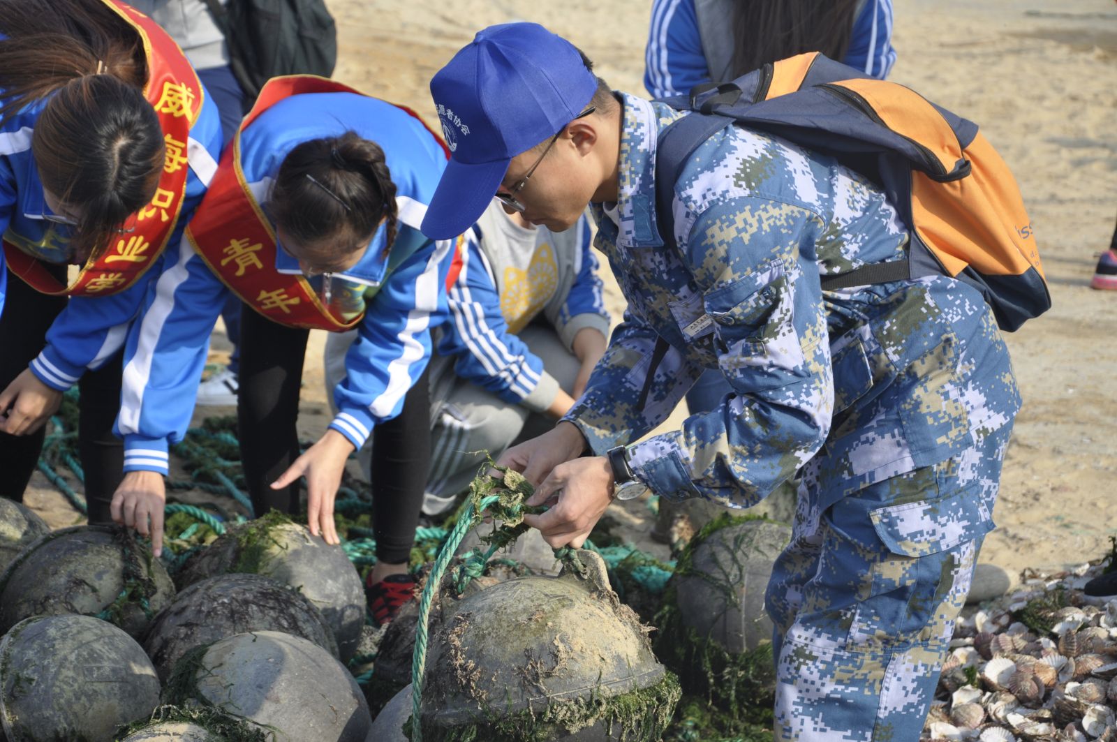 2016年10月30日的北海秋高气爽,志愿者们迎着清爽的秋风,以各学校为单位帮助渔民们来分拣贝壳,装卸货物。他们弯下腰,认真的干起手中的工作。坚持着“不怕辛苦,甘于奉献”的公益精神,志愿者们不怕脏,不怕累,帮助辛苦的渔民们。随后志愿者们又来到了海边,人手一个垃圾袋,不肯放过任何一个角落,认真寻找散落在海边的垃圾,让碧海金沙更美。