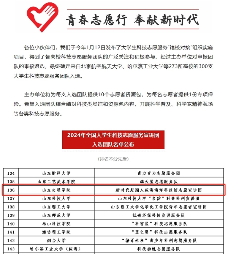 “新时代赶潮人威海海洋科技馆志愿宣讲团”成功入选2024年全国大学生科技志愿服务宣讲团。