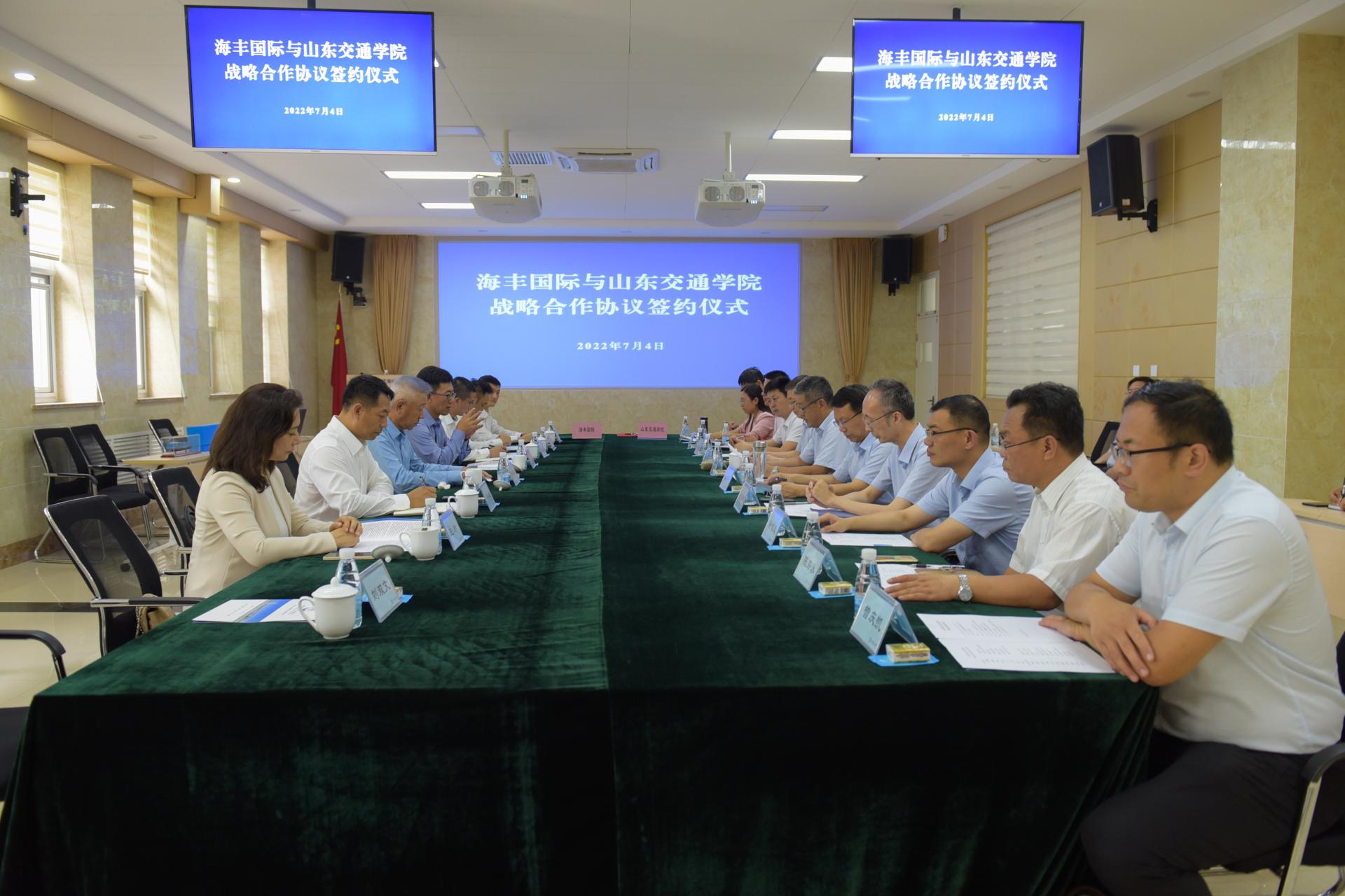 为打造校企合作新高地,培育校企合作新特色,树立校企合作新典范,7月4日,我校与海丰国际控股有限公司在威海校区明德楼第一报告厅举行战略合作协议签约仪式。海丰国际控股有限公司董事会主席杨绍鹏,执行董事、航运集团总裁薛明元,船管总经理田明远;我校党委副书记、院长陈松岩,党委委员、副院长姜华平,党委委员、副院长张化祥共同出席签约仪式。仪式由姜华平主持。