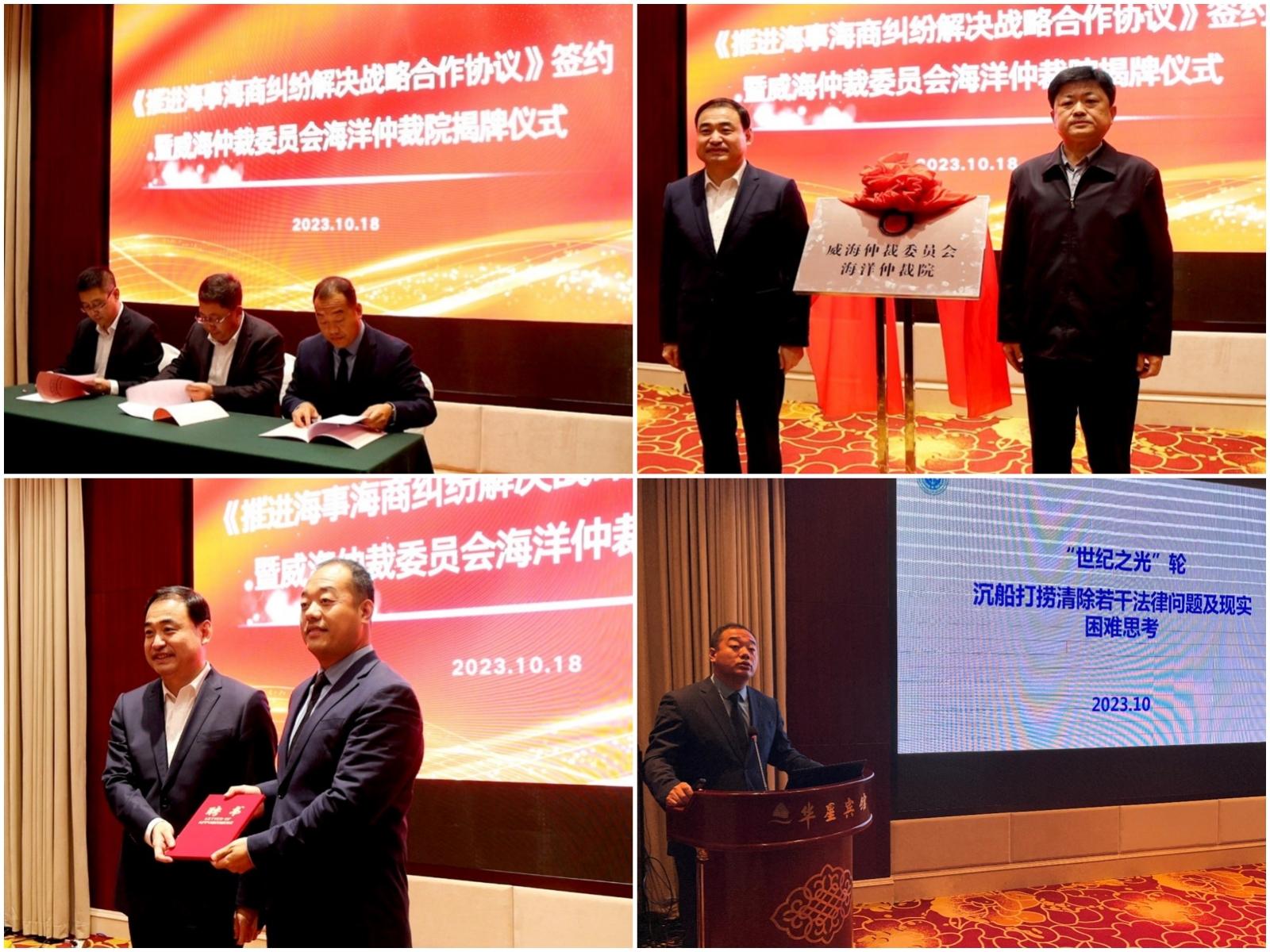 活动中,我校威海市海事海商法研究中心与威海仲裁委员会秘书处、荣成司法局共同签署了《推进海事海商纠纷解决战略合作协议》。会议为威海仲裁委员会海洋仲裁院揭牌,并向贾建伟颁发聘书。贾建伟与来自大连海事大学、威海律师协会及众成清泰律师事务所相关专家学者进行学术交流。